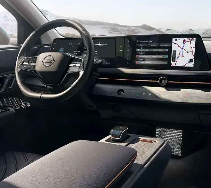Please come in. The spa-like nature of the Nissan ARIYA welcomes you with a wide-open design, comfortable Zero Gravity seats and a sliding center console that can reshape your sense of comfort. (*) A serene ambience fills the cabin from a glowing lantern under the dash.